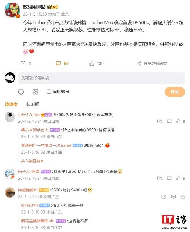博主 @数码闲聊站 今日爆料称,今年 Turbo 系列产品力继续升档(预计指 REDMI Turbo 系列手机),Turbo Max 确定首发 D9500s(天玑 9500s 处理器),满配大缓存 + 超大规模 GPU,妥妥正统旗舰芯,性能预估对标骁龙 8E、稳压骁龙 8G5 处理器。
