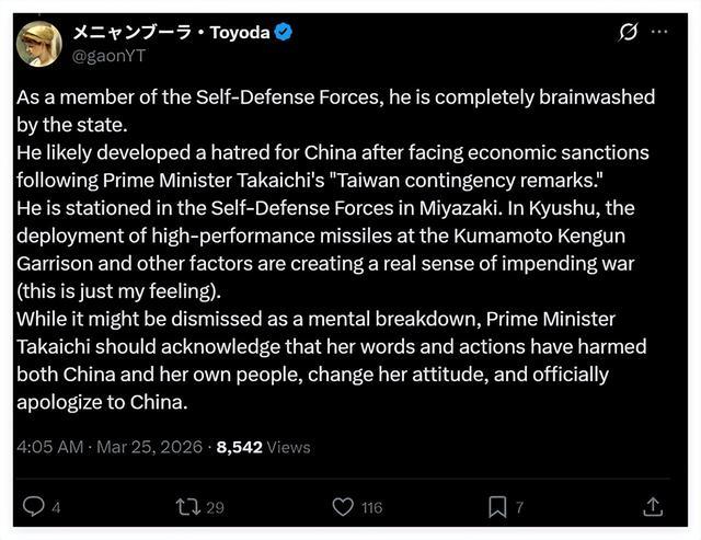 这位来自日本福冈的网民进一步表示,这种洗脑来自多个方面,比如以日本首相高市早苗为代表的日本右翼势力,通过不断挑衅和触怒中国,在日本国内煽动仇视中国的情绪;另一方面,高市还在加紧推行日本的军事化,从而营造出一种“战争迫在眉睫”的假象——比如,在村田晃大驻扎的日本九州,日本自卫队前不久刚在那里强行部署了射程达1000公里、可覆盖邻国沿海区域的远程导弹。