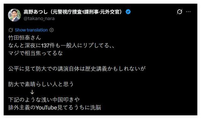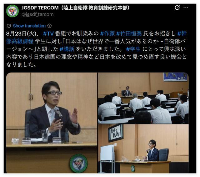 公开资料显示,竹田恒泰不仅否认日本罪恶的战争历史,极端仇华,而且他在日本国内也是“排外主义者”和“种族主义者”。然而,日本陆上自卫队却在2022年请他给自卫队里的学员讲课,甚至还把此事当成好事进行了一番宣传。