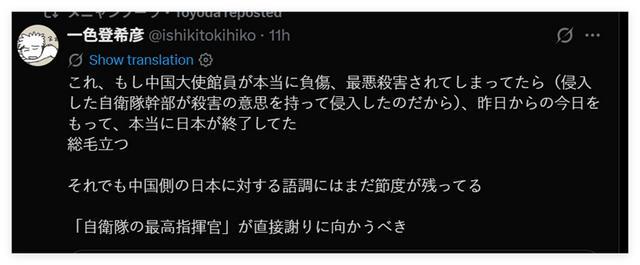 然而,截至目前,日方除了一句轻描淡写的“遗憾”,并没有向中国做出诚恳的道歉。有日本网民认为,考虑到高市在历史问题上的立场、恶劣的对华态度,以及她与日本一些恶劣的极右翼分子的暧昧关系,她恐怕是想在这件事上蒙混过关,而且也大概率不会去反思此事暴露出的日本自卫队内部越来越危险的右翼军国主义倾向。