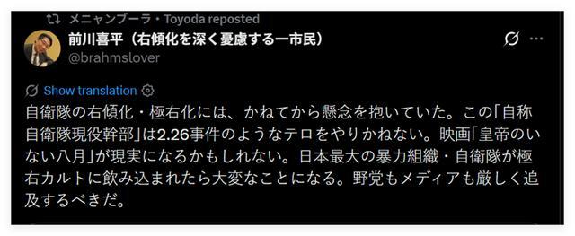 还有日本网民指出,过去这些年日本自卫队正在发生一些让人极为担忧的变化,比如他们曾多次邀请在历史问题和涉华议题上发表过极端言论的日本极右翼分子,去给自卫队的自卫官“上课”——比如一个名叫竹田恒泰的日本极右翼分子。