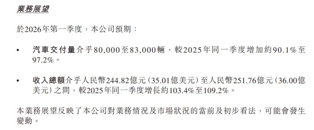 下一个季度的展望,蔚来则表现的有点保守。根据财报指引显示,蔚来2026年一季度的销量给出了8.0-8.3万台的预期。