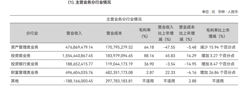 业务端来看,投资类与财富管理类业务实现增长,资管类与投行类业务有所回落。其中,投资类业务为营收核心支柱,全年实现营业收入15.54亿元,同比增长45.83%;财富管理类业务实现营业收入4.97亿元,同比增长22.33%,业务拓展成效显著;资管类业务实现营业收入4.77亿元,同比下滑47.55%,营收规模出现较大幅度收缩;投行类业务实现营业收入1.89亿元,同比下滑3.54%,营收小幅回落。